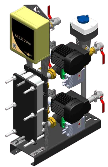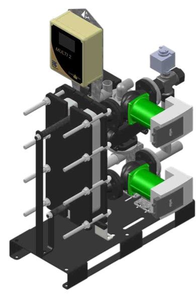 • Plaques INOX 316 anti incrustation  0,4 mm • Joints NBR clipsés • Tuyauterie primaire et secondaire INOX •  Vanne 3 voies et servomoteur avec commande  manuelle • Pompe Classe A , variateur de fréquence intégré (non  piloté) • Pompes rotor sec avec moteur ventilé au secondaire  (option sur séries 2500 et 3000) • Traitement de surface du bâti peinture époxy • Monté sur socle peinutre époxy • Certification ACS • Box d’isolation thermique